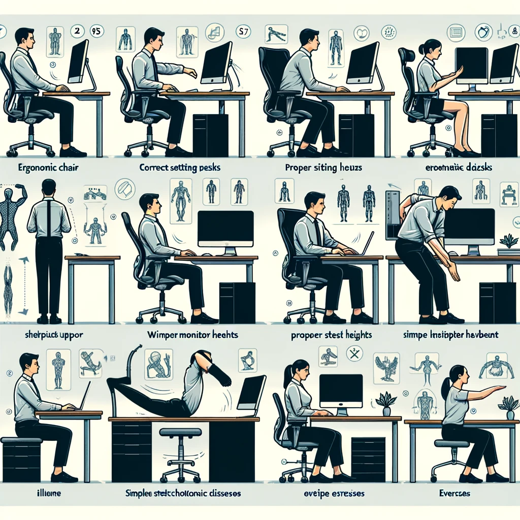 - 인체공학적 사무용 가구 사용: 인체공학적 의자와 조절 가능한 책상을 사용하여 척추에 무리가 가지 않도록 합니다. 또한, 모니터는 눈높이에 맞추어 두어야 합니다.
